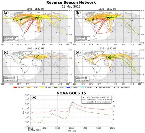 Solar flares and geomagnetic storms can significantly impact the ability to commicute on the medium and high frequency (300 kHz - 30 MHz bands). Solar flares cause radio blackouts due to collisional absorption from enhanced D-region ionization, especially on the lower frequencies. Geomagnetic storms can cause large-scale depletions of ionospheric densities that can reduce the maxium usable frequency (MUF) on a global scale. These impacts can be observed in large-scale amateur radio networks such as the Reverse Beacon Network, WSPRnet, and PSKReporter.